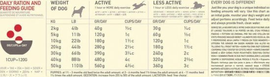 Voedingsadvies:Gewicht hond (kg)Niet-actief (gr/dag)Actief (gr/dag)24060560120101201802020030030270420403305105040060060450690Samenstelling:Lamsvleesmeel (23%), Gesneden haver (22%), Verse Angus rundvlees (5%), Vers Yorkshire varken (5%), Lams vet (5%), Hele rode linzen, Hele groenen erwten, Hele groenen linzen, Vers gras gevoerd lam (4%), Hele haver, Verse runderlever (2%), varkensvlees meel (2%), Haring olie (2%), Verse varkenslever (2%), Hele garbanzo bonen, Hele gele erwten, Zon gedroogde alfalfa, Linzen vezel, vers rundvlees pens (1%), Gedroogde bruine zeewier, Verse pompoen, Verse butternut squash, verse pastinaak, Verse groene boerenkool, Verse spinazie, Verse wortelen, Verse Red Delicious appels, Verse Bartlett peren, Gevriesdroogde rund lever (0.1%), Verse cranberries, Verse bosbessen, Cichoreiwortel, Kurkuma, Mariadistel, kliswortel, Lavendel, heemstwortel, rozenbottels.